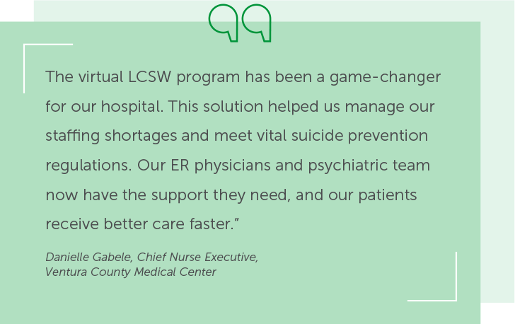 Hospitals today face a variety of challenges, from workforce shortages to regulatory compliance. With limited resources and a critical need for Licensed Clinical Social Workers (LCSWs) to meet suicide prevention regulations, one safety-net hospital system in California implemented an innovative virtual LCSW program to ease the pressure on their full-time teams and improve patient care.